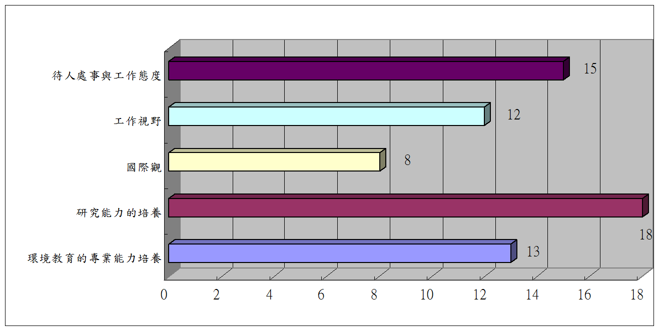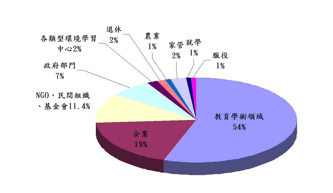 資料來源: 周儒、陳孟可(2012年11月)。〈國立臺灣師範大學環境教育研究所校友職場發展調查研究〉。《2012中華民國環境教育學術及實務交流研討會》。2012年11月9-11日。國立台灣師範大學。