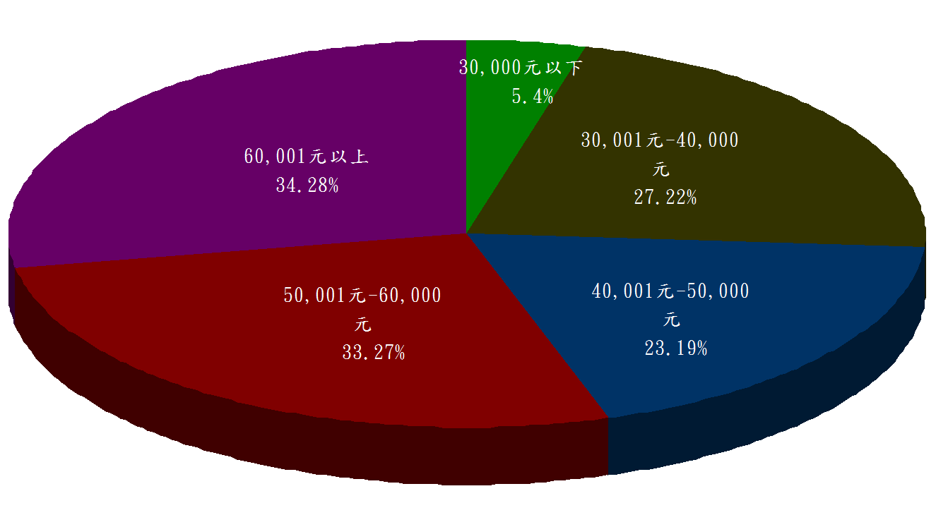 畢業生薪資月所得狀況,以60,001元以上最多,122位中共34位佔27.9%,其次是薪資月所得50,001元-60,000元有33位佔27.0%,前兩名合計約有5成5受試者薪資月所得在新台幣5萬元以上,如表所示。
