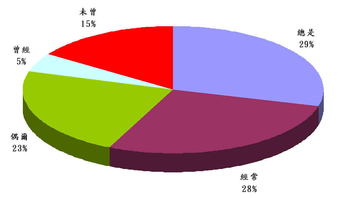 123位受訪校友中,工作內容與環境教育相關程度,答「總是」與「經常」相關的共有70位,比例高達57%。,校友總計達八成有從事與環境教育相關實務工作經驗。