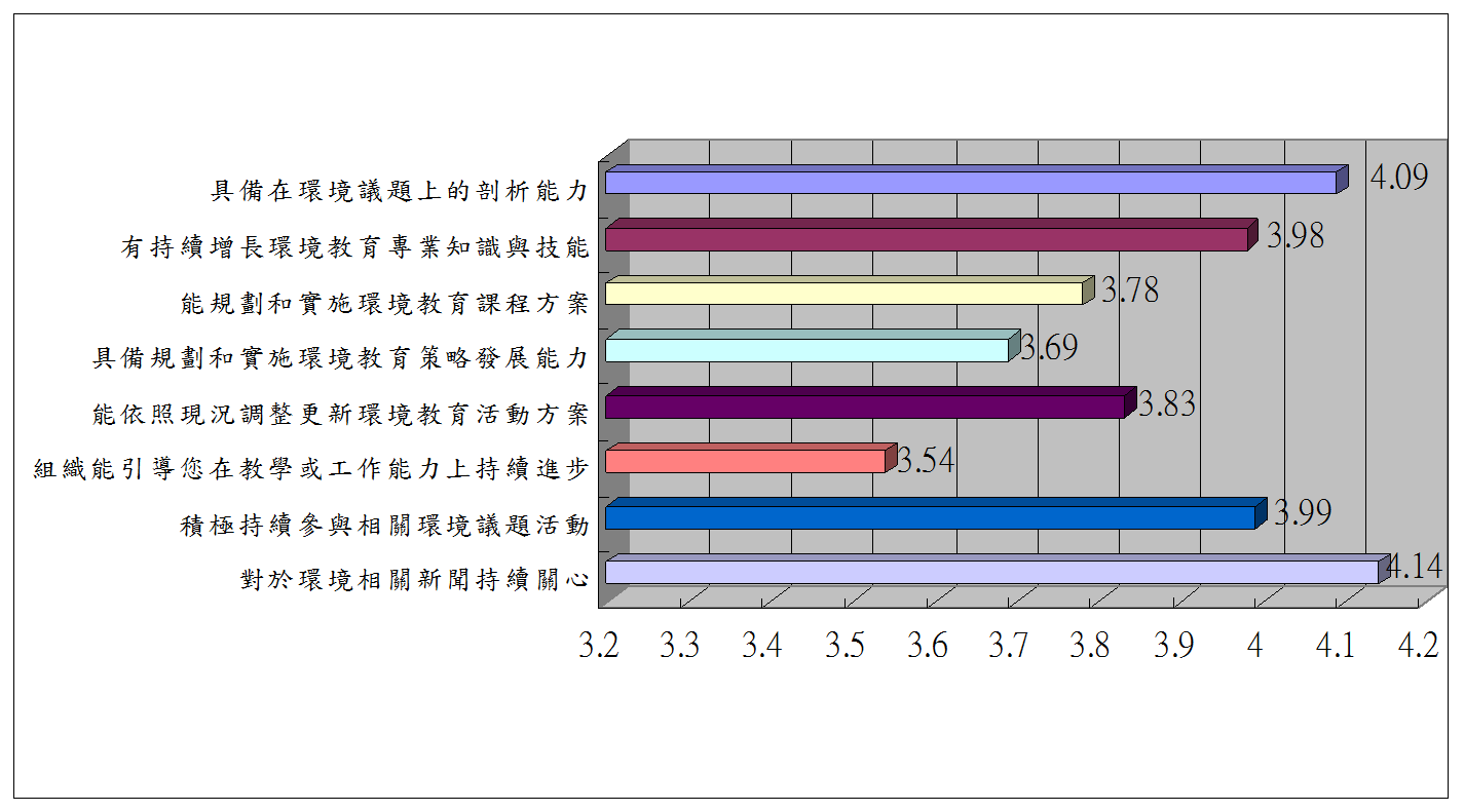 對於「工作以來在環境教育專業成長的狀況」,本所校友大都認為個人離校後在環境教育專業成長的狀況持正面肯定的看法(各項目平均皆大於3.50),而由各項目的平均值來看,以「對於環境相關新聞持續關心」為最高(m=4.14),其次為「具備在環境議題上的剖析能力」。